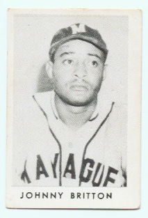 1949-50 Toleteros card of Negro Leaguer Johnny Britton. Britton was the 3rd baseman for the Birmingham Black Barons of the 1940's. In addition to Puerto Rico, he also played in Canada, Japan, Mexico, and toured with Satchel Paige's All-Star barnstorming team.