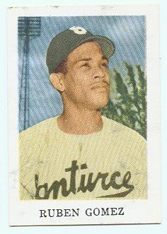 Ruben Gomez. This card was issued one year prior to his MVP season of 1951-52. A HOFer and legend in Puerto Rico, Gomez played for an astonishing 28 years in the Puerto Rican league, all for Santurce. He is the winningest pitcher in the island's history with 174 career wins (most seasons were only 60 games). He pitched for 9 championship teams in Puerto Rico. Known for his wicked screwball, he began in 1947-48 and pitched in the league until he was 49 years old.