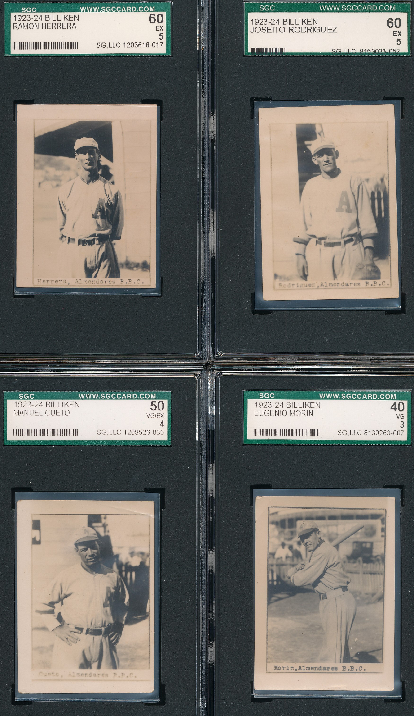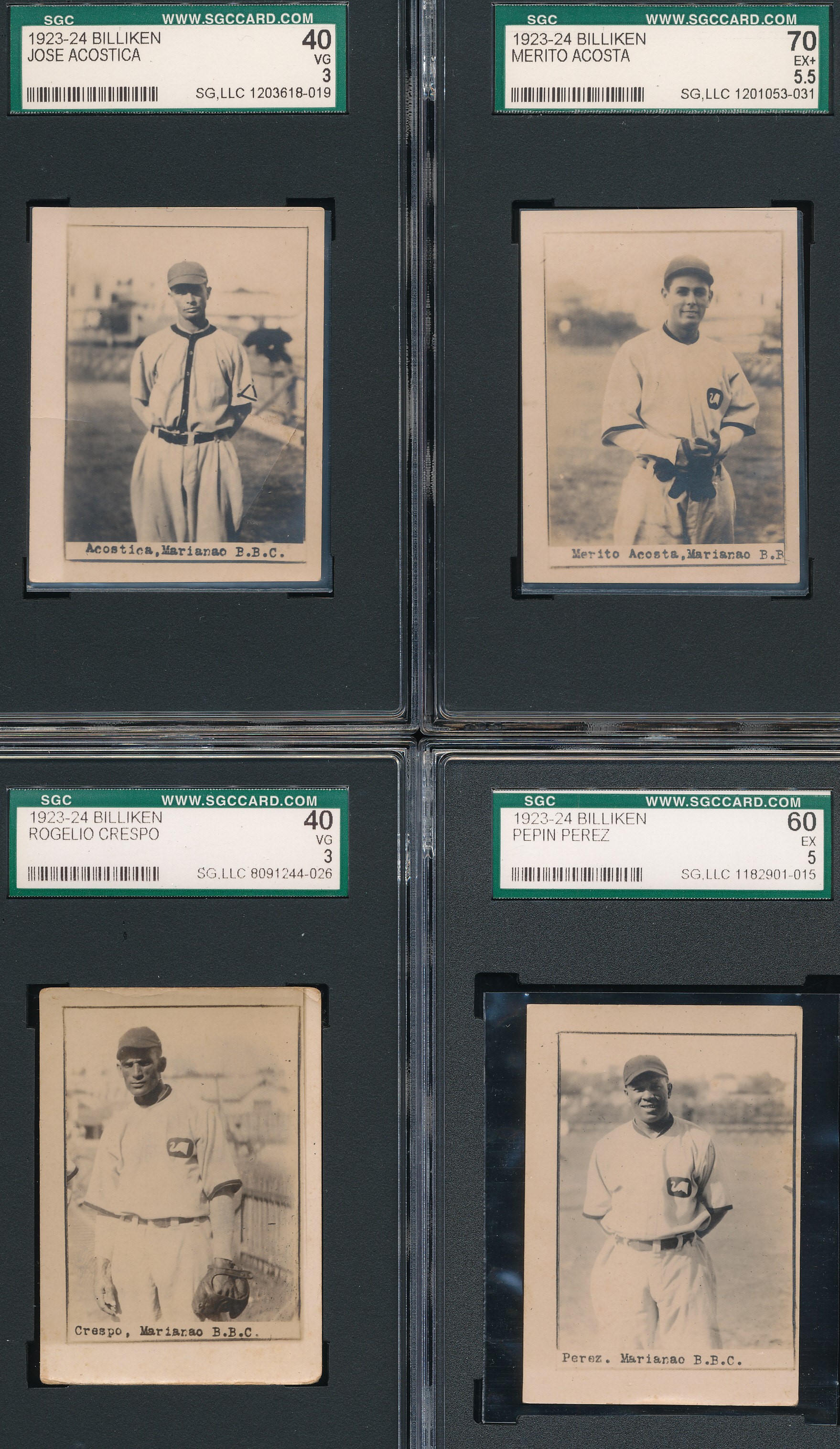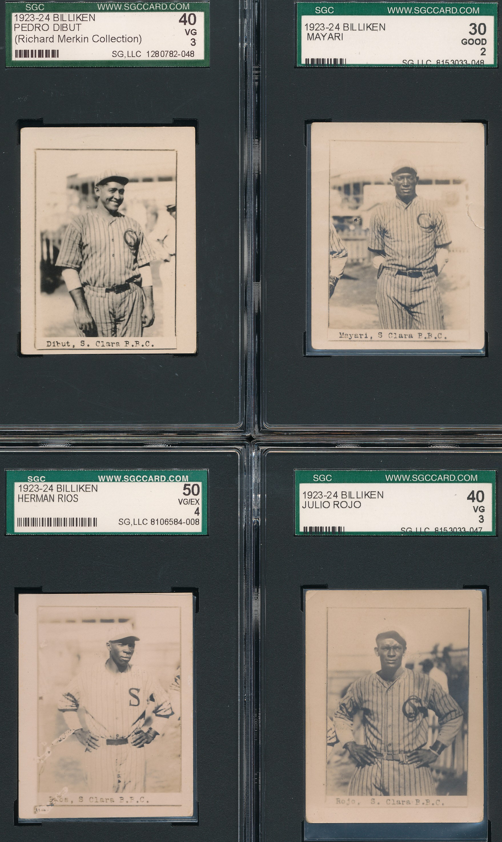 The 1923-24 Billiken set is widely considered one of, if not THE most desirable of all Cuban baseball card issues. They were issued in packs of "Billiken" brand oval-made cigars. Unlike many other Cuban issues of the 1920s, the images are all unique and cannot be found elsewhere. Printed on photographic stock, each card shows a player in uniform from around the knees up with La Boulanger Park in Santa Clara visible in the background. The cards can vary in size, with most being around 1 15/16" by around 1 5/8". The photographer is unknown, but with what was captured with these images, they must have been some kind of Cuban Charles Conlon.