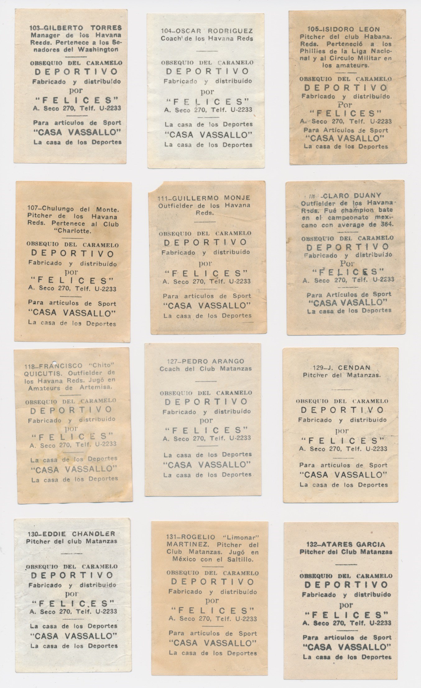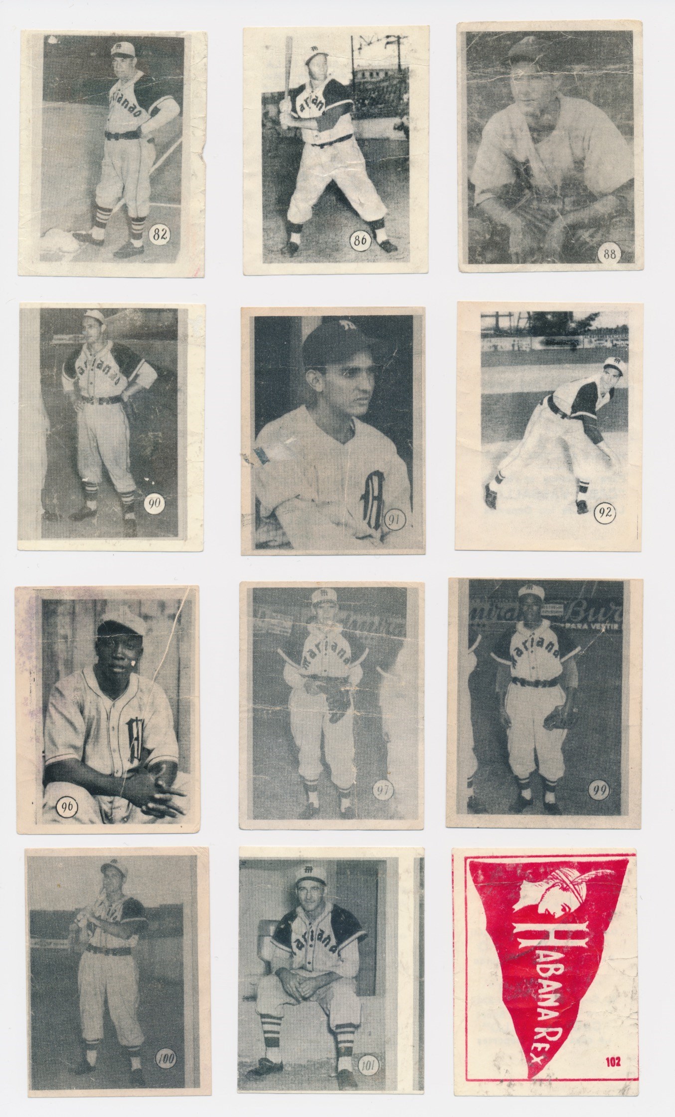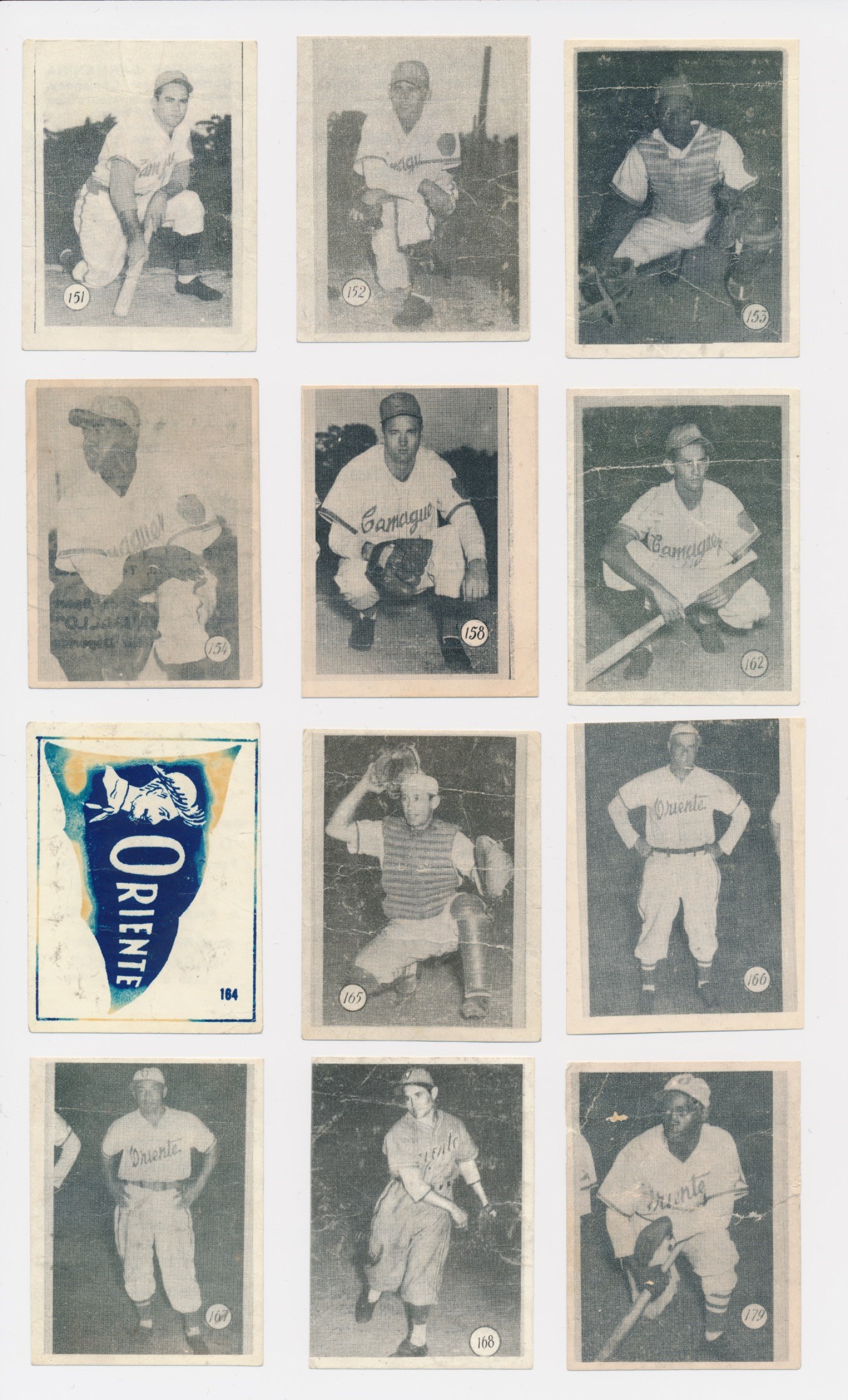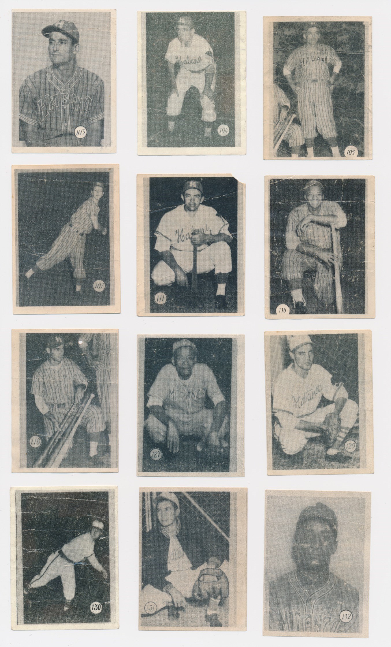 1946-47 Caramelo Deportivo starter set. Lot of 75 cards including 17 Negro Leaguers. For the most part, condition is average to above average for this set. The 1946-47 Caramelo Deportivo set is significantly more rare than the 1945-46 set. It includes cards from all four teams in the regular Cuban League (Almendares, Habana, Cienfuegos, Marianao) as well as all four teams in the National Federation League (Habana Reds, Oriente, Camaguey, Matanzas).