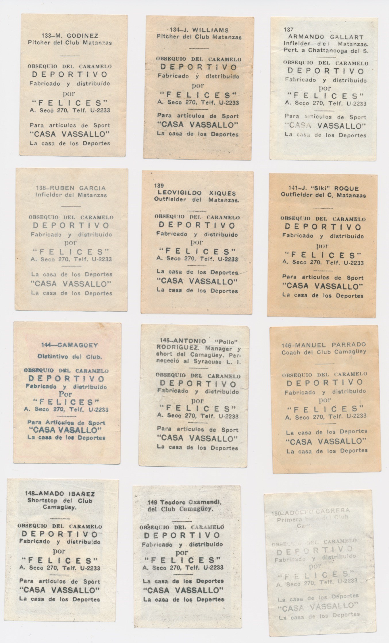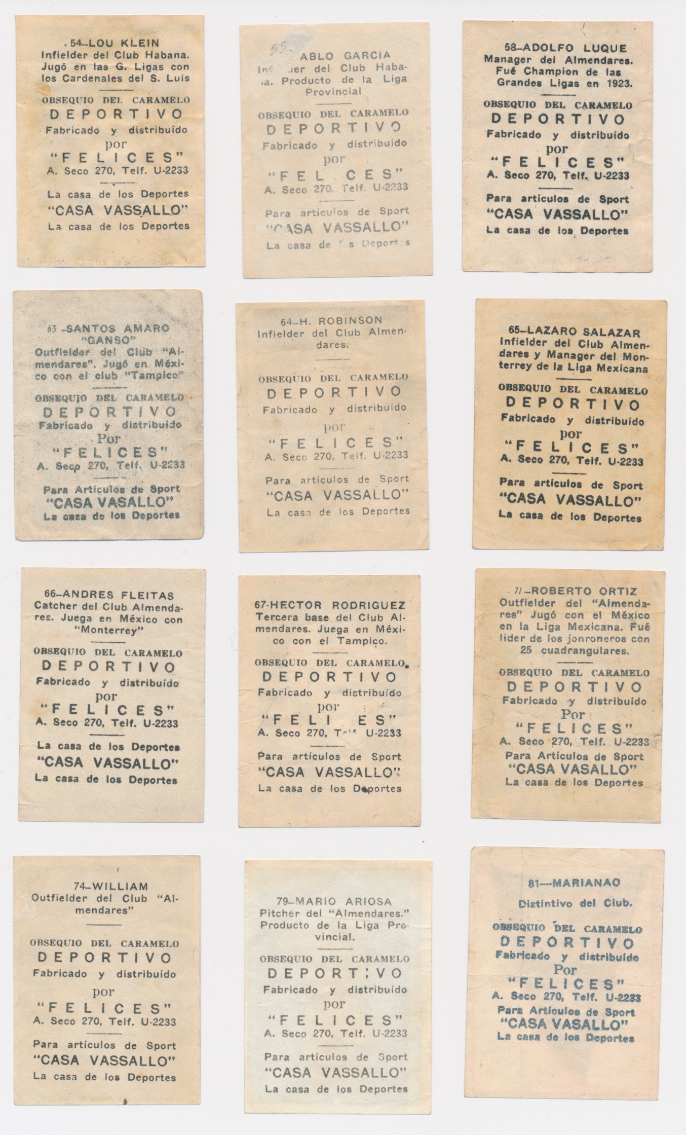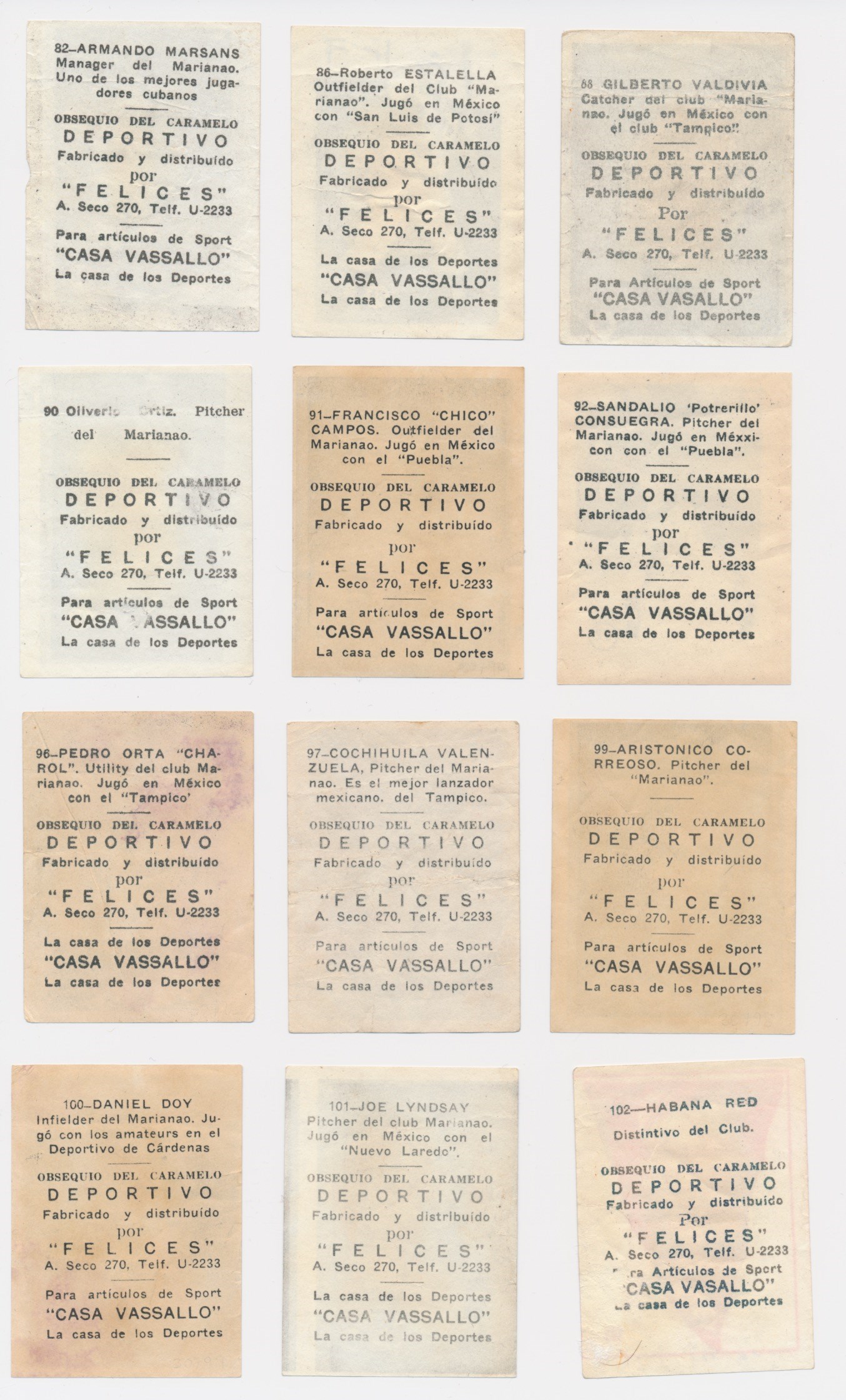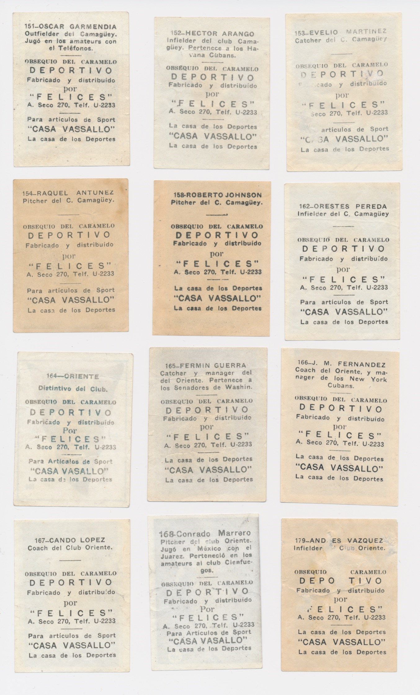 1946-47 Caramelo Deportivo starter set. Lot of 75 cards including 17 Negro Leaguers. For the most part, condition is average to above average for this set. The 1946-47 Caramelo Deportivo set is significantly more rare than the 1945-46 set. It includes cards from all four teams in the regular Cuban League (Almendares, Habana, Cienfuegos, Marianao) as well as all four teams in the National Federation League (Habana Reds, Oriente, Camaguey, Matanzas).