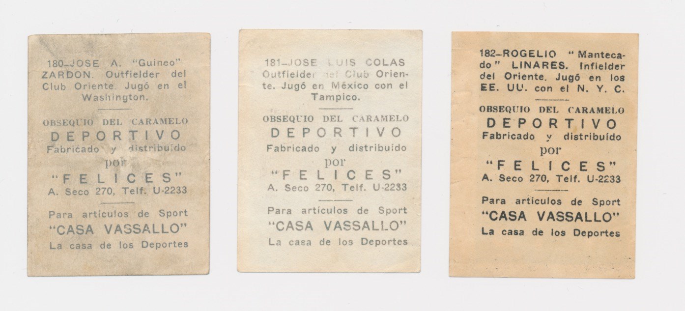 In 1946, a group of “outlaw” Major Leaguers jumped to the Mexican League, lured by higher salaries. MLB commissioner Happy Chandler was not happy that players were being poached so he famously banned any MLB player who jumped to Mexico from returning to the Majors for 5 years. Danny Gardella was the first of the “outlaw” players to go to Mexico, where he earned twice the salary he did in the United States. There were 21 MLB players in total who jumped to Mexico and were banned by MLB. Gardella later sued MLB and the five-year ban was dropped in June of 1949. Many of these banned players played in Mexico in the summer and Cuba in the winter, before going back to the Majors in 1949. The 1946-47 Cuban League was considered an “outlaw” league and Chandler warned American players not to play in it or they would face suspension. As a result, a competing league called “Federacion Nacional” was established as a sanctioned competitor to the regular Cuban League. Many of the outlaw MLB players who had jumped to Mexico also played in the regular Cuban League, since they were already banned for five years. A number of those banned “outlaw” players are included in this lot. Card #179 has a large tear. Includes: