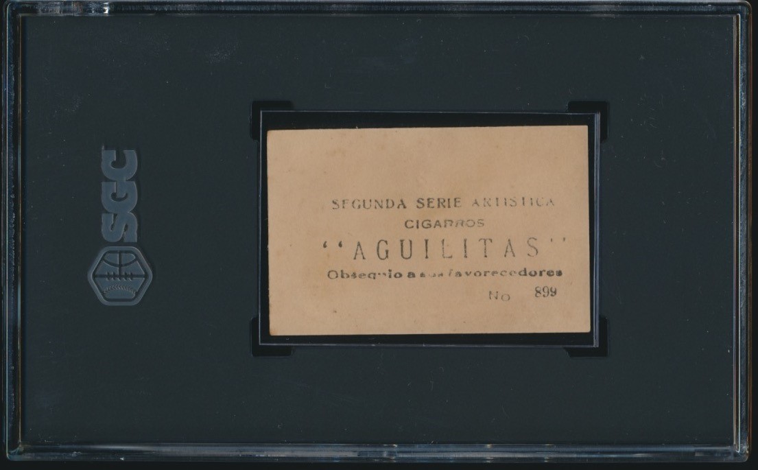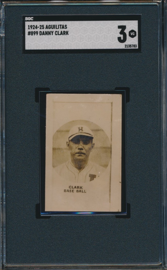 1924-25 Aguilitas Segundas #899 of Jay Clarke. Originally misidentified as Danny Clark, it was later determined that "Clark" is actually Jay "Nig" Clarke, who played in the Majors for 9 seasons from 1905 to 1920. Graded a 3 by SGC. There have been 7 examples graded by SGC, only one has graded higher than this one.