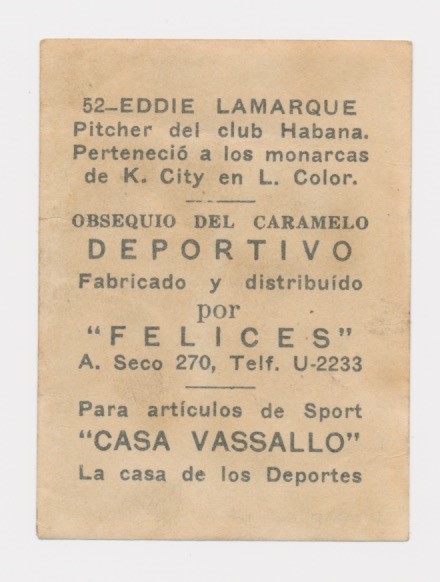 1946-47 Caramelo Deportivo #52 of Negro Leaguer Jim Lamarque. Lamarque (also called "Lefty") was one of the top pitchers for the Kansas City Monarchs in the 1940s.