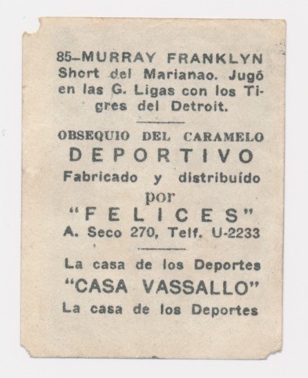 1946-47 Caramelo Deportivo card #85 of Jewish player Murray "Moe" Franklin. He played in the Majors for two season with the Detroit Tigers in 1941 and 1942.