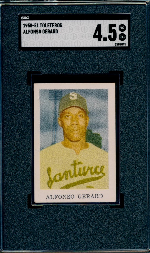1950-51 Toleteros card of Negro Leaguer Alphonso Gerard. Graded a 4.5 by SGC. Gerard played in the Negro Leagues with the New York Black Yankees, Indianapolis Clowns, and Chicago American Giants.