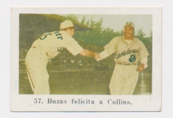 1950-51 Toleteros In Action card #57 featuring Negro Leaguer Gene Collins and teammate Joe Buzas.
