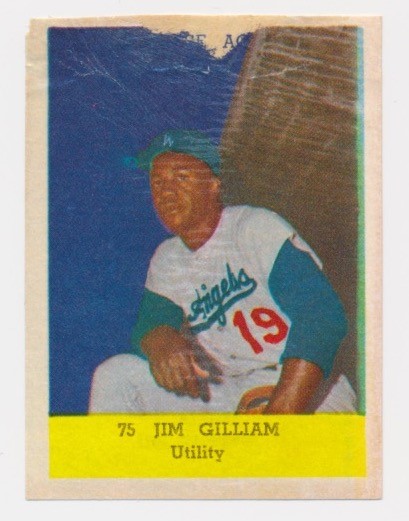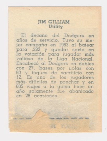 1964 Peñafiel card #75 of Jim Gilliam. Damage to top edge and paper stuck to the reverse. One of about five known examples. Prior to the 1964 season, the Dodgers did a brief barnstorming tour in Mexico City. Fortunately the Dodgers were included in the baseball card set for the Mexican League that year. The images of the Dodgers are all unique and from that tour, mostly in the dugout in Mexico City.