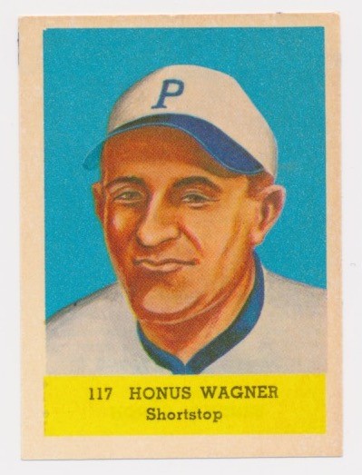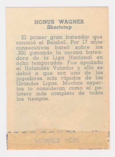 1964 Peñafiel card #117 of HOFer Honus Wagner. Has album paper stuck to part of the back, similar to most Peñafiel cards.