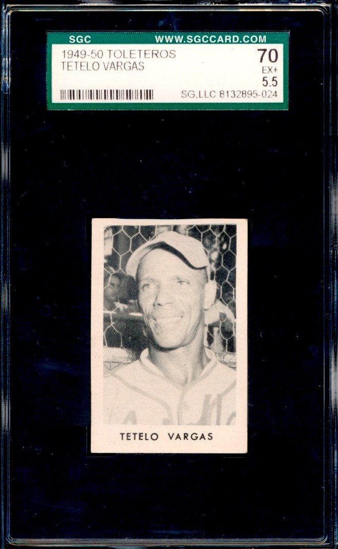 1949-50 Toleteros card of the Dominican Deer, Juan Esteban "Tetelo" Vargas. Graded a 5.5 by SGC. There have been 14 examples of this card graded by SGC, with only one grading higher than this one. Vargas played for the Cuban Stars East and New York Cubans in the Negro Leagues. His playing career lasted nearly three decades in numerous countries. He won the batting title in the 1953 Dominican League at the age of 47. His .471 batting average in 1943 is the highest in the history of the Negro Leagues. One of the fastest players ever to step on a baseball diamond, he should have been elected to the Hall of Fame many years ago.