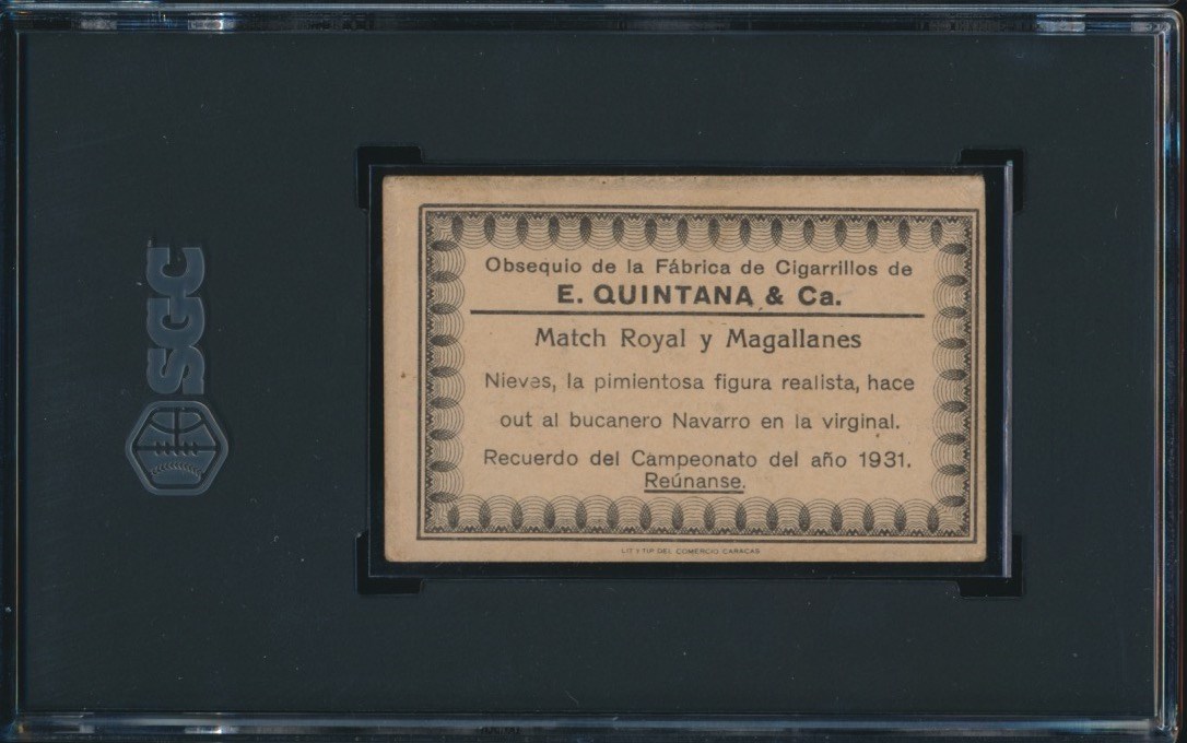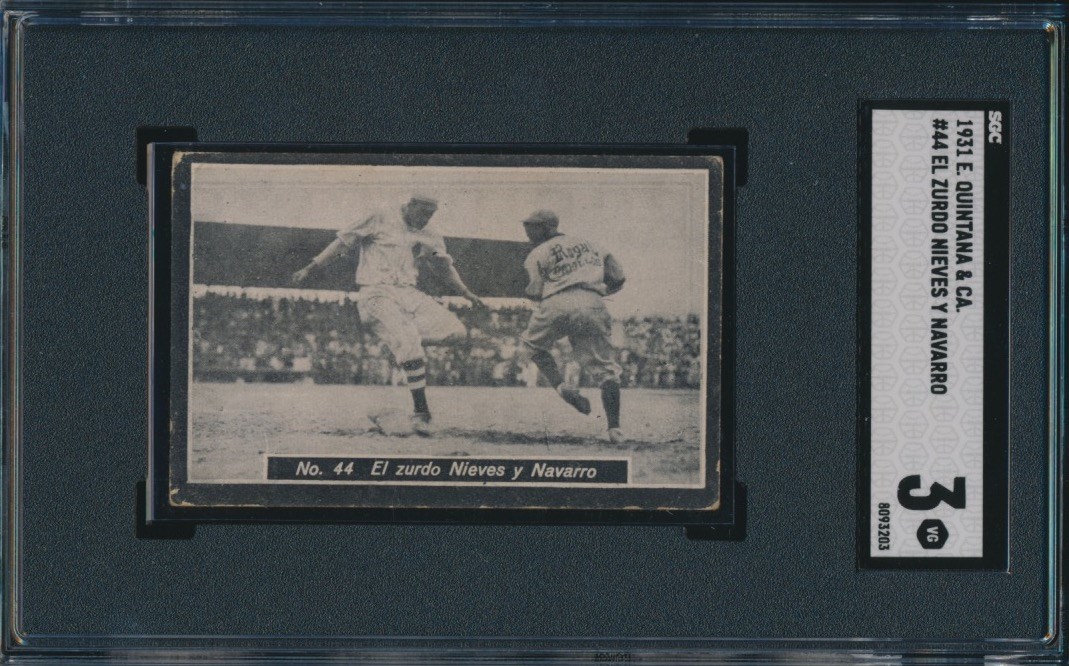 1931 E. Quintana (Doble Aguila) #44 featuring Negro Leaguer, Emilio "Millito" Navarro and Nieves Rendon. Graded a 3 by SGC. This is the only example of this card SGC has graded. Of the 21 examples SGC has graded from this set, 7 graded higher than this one.