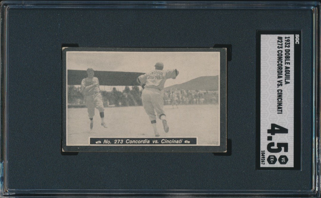 1932 Doble Aguila #273. This is a very interesting card. The player named on the card is Palacios, a player for the Cincinati team that is seen running to first base. What's interesting is the Concordia player playing first base. Martin Dihigo was on this Concordia team. The few box scores I have for this Concordia team have Dihigo pitching, but it's possible he played first base when he wasn't pitching. I can tell you that I have owned or seen hundreds of photos of Dihigo, and the body type of the first baseman on this card is EXACTLY Dihigo's body type, and I'm not aware of any other player on that team with that body type. Unfortunately there is no way to definitively say that player is Dihigo, so this card will remain a card of "Palacios," but I'm fairly certain