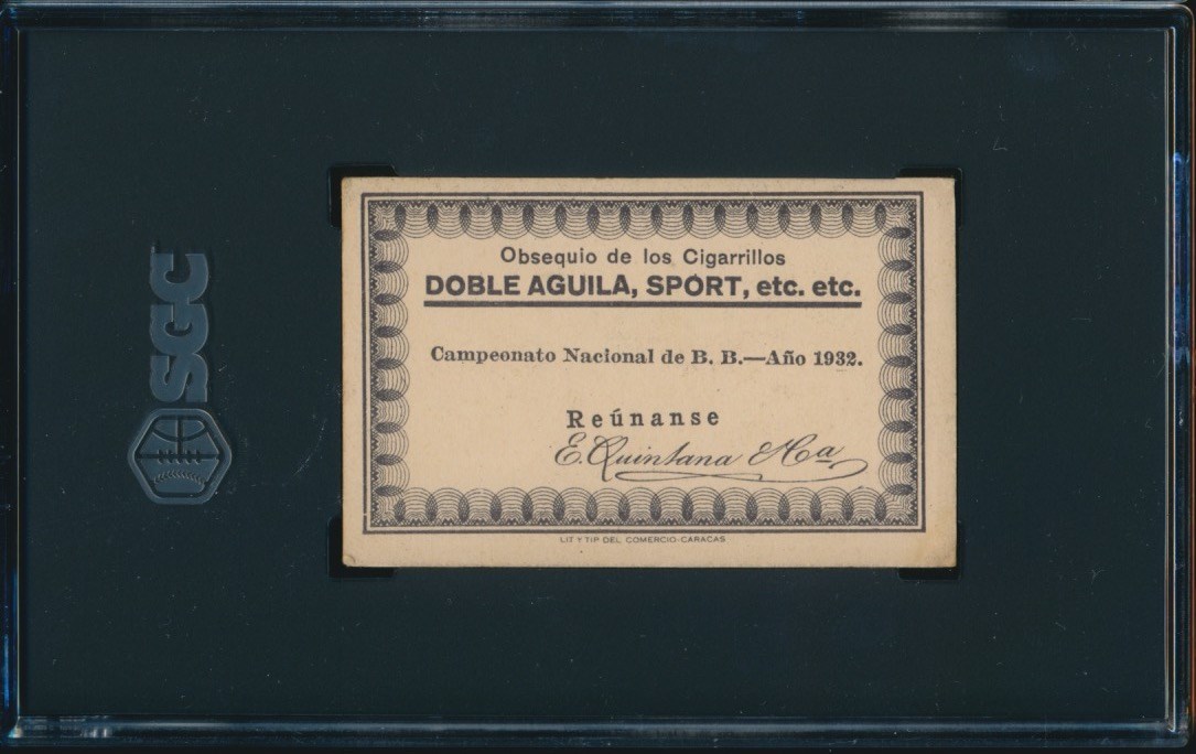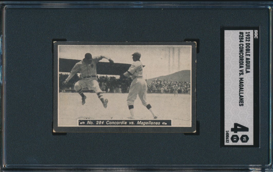 1932 Doble Aguila #284. There are no players named on this card, but the first baseman for Concordia looks A LOT like Martin Dihigo, who was on this team. See lot 14 for more info. Card is graded a 4 by SGC. Of the 45 examples SGC has graded from this set,