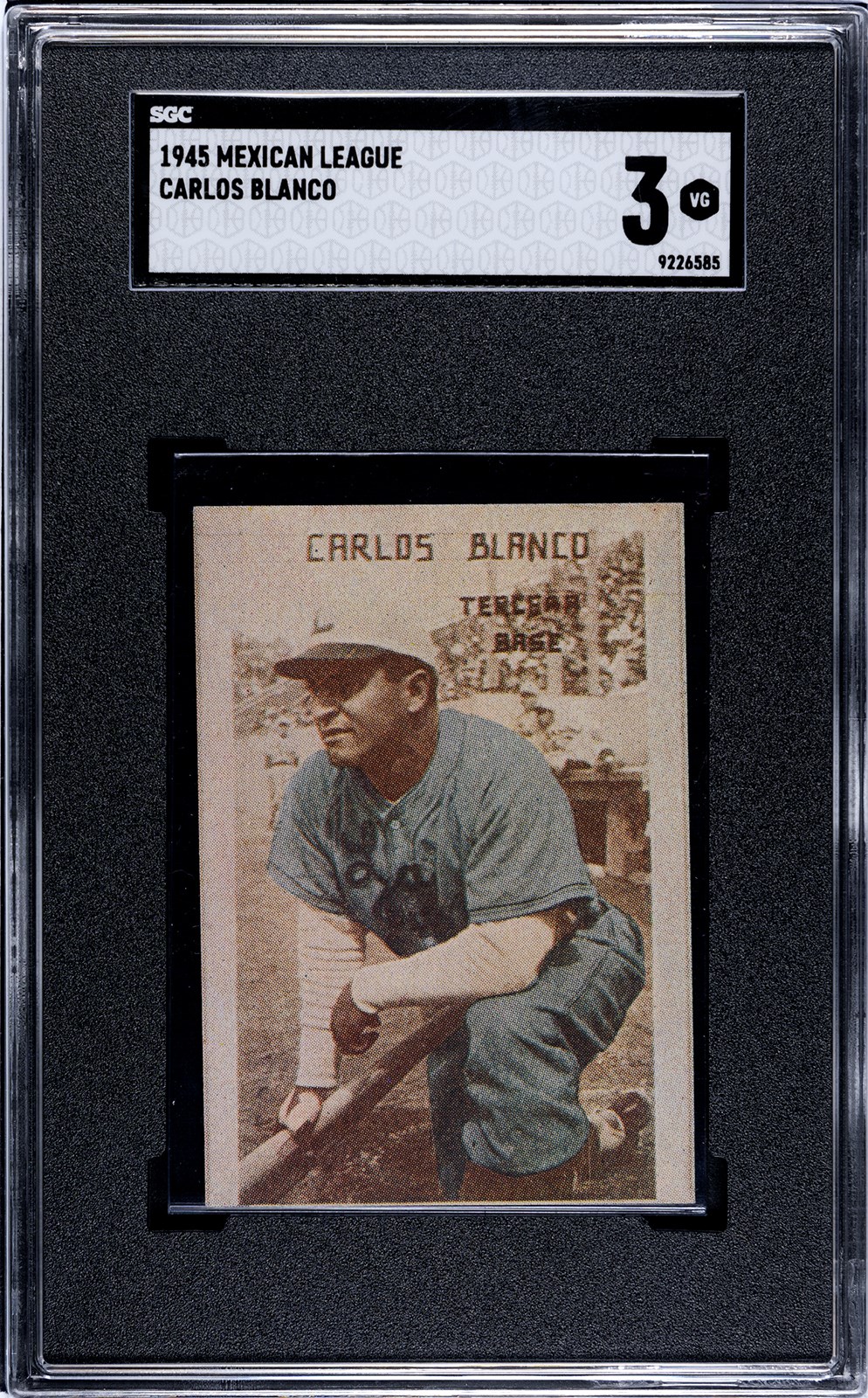 1945 Mexican League card of Negro Leaguer, Carlos Blanco. Blanco played for the New York Cubans in the Negro Leagues. SGC has graded 33 total examples from this set, with only two grading higher than this one. The highest is a 4. This is the only example of this card graded by SGC.