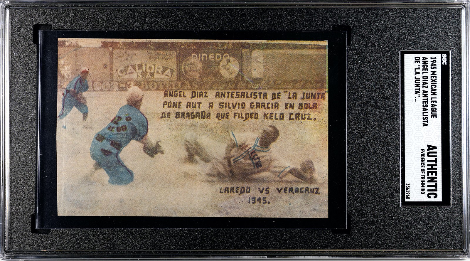 1945 Mexican League In Action card featuring Negro Leaguers Ramon Bragaña and Silvio Garcia. Both players deserve plaques in Cooperstown, in my opinion. The In Action cards in the 1945 Mexican League set are significantly larger than the regular player cards. The regular cards measure a little under 2" by 2 3/4". The In Action cards measure around 2 3/4" by 4 1/4". SGC has graded this Authentic, "Evidence of trimming," which is interesting because all of these cards were hand-cut, and therefore all trimmed. One of the rare (shocking I say!) times the current graders at SGC have been totally incompetent.