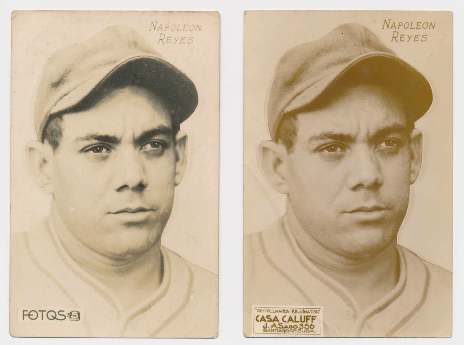 The 1946-47 Fotos postcard set is in high demand due its scarcity and quality images. But Casa Caluff postcards are basically impossible. There are less than a dozen examples known, with no duplicates. In the bottom left corner where it would normally contain the advertising for Fotos Magazine, it advertises for "Casa Caluff," a refrigerator company located in Santiago. This one features Lazaro Medina. I've included images of the Napoleon Reyes Fotos postcard and Casa Caluff postcard for comparison. Those are not included in this lot and are for educational purposes only.