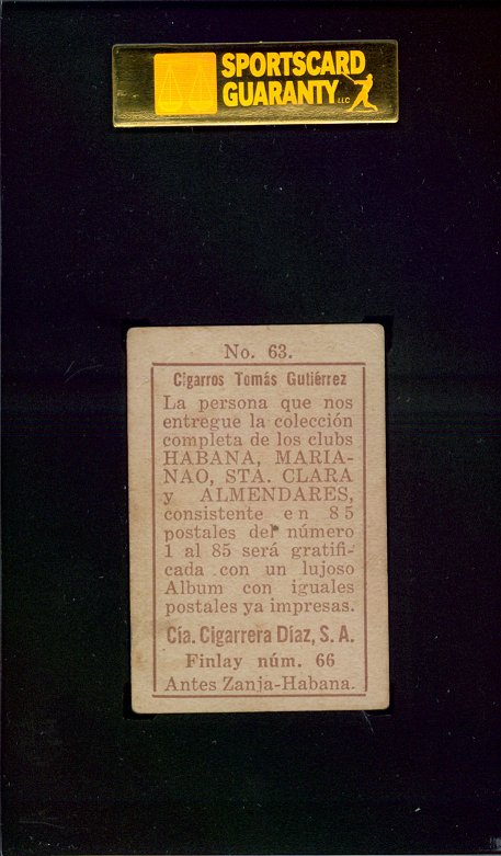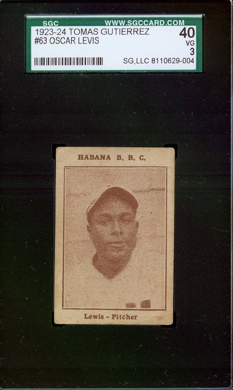 Scarce 1923-24 Tomás Gutiérrez card #63 of Oscar Levis. The Panamanian born Levis twice led the Cuban league in wins and had a Negro League career spanning from 1921 to 1932, primarily for the Cuban Stars. This is his rarest card.