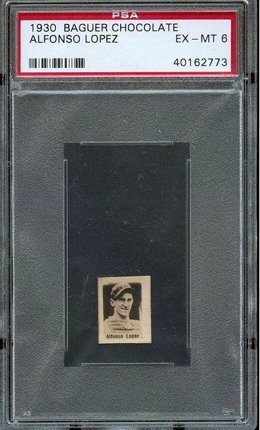 1930 Baguer Chocolate card of HOFer Alfonso Lopez. Had a 19-year career as a player and a 15-year career as a manager that included over 1,400 wins. Was the last manager to take the White Sox to the World Series.